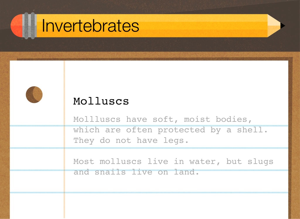 Mollluscs have soft, moist bodies, which are often protected by a shell. They do not have legs.