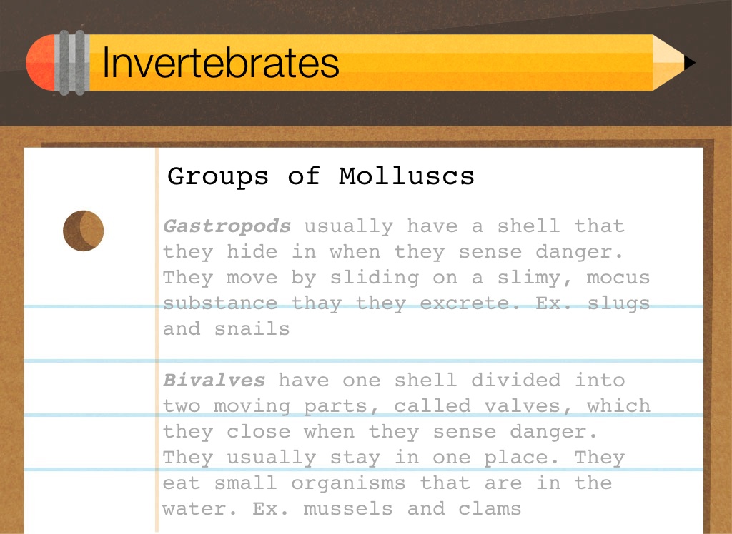 Bivalves have one shell divided into two moving parts, called valves, which they close when they sense danger. They usually stay in one place. They eat small organisms that are in the water. Ex. mussels and clams