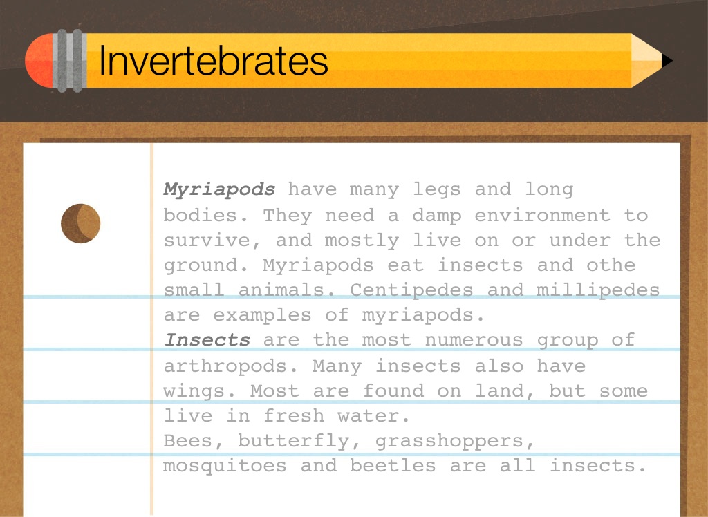 Myriapods have many legs and long bodies. They need a damp environment to survive, and mostly live on or under the ground. Myriapods eat insects and othe small animals. Centipedes and millipedes are examples of myriapods.