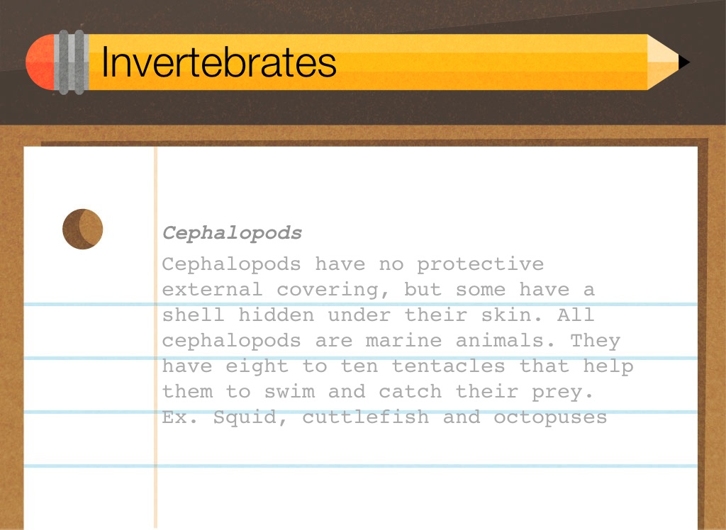Cephalopods have no protective external covering, but some have a shell hidden under their skin. All cephalopods are marine animals. They have eight to ten tentacles that help them to swim and catch their prey.