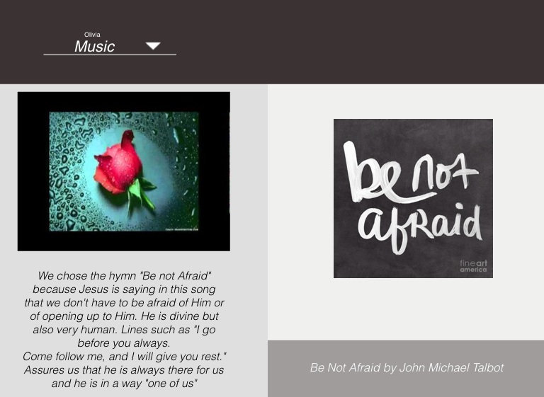 We chose the hymn "Be not Afraid" because Jesus is saying in this song that we don't have to be afraid of Him or of opening up to Him. He is divine but also very human. Lines such as "I go before you always.