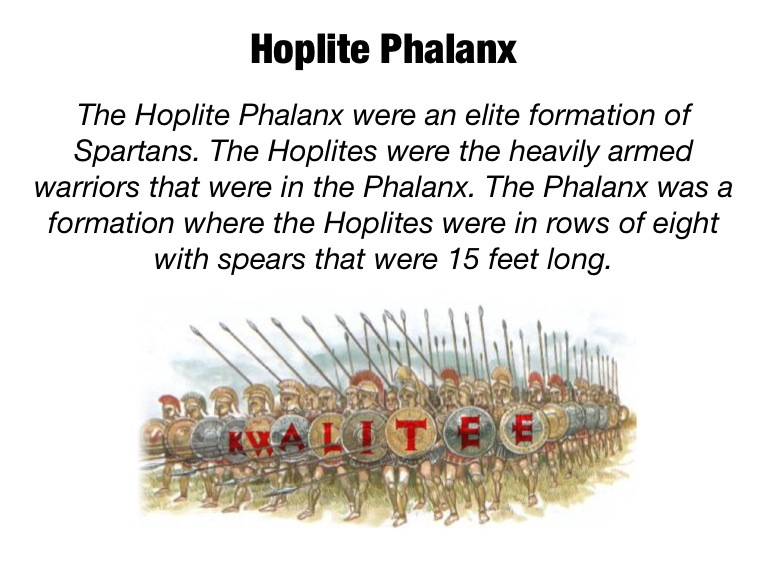 The Hoplite Phalanx were an elite formation of Spartans. The Hoplites were the heavily armed warriors that were in the Phalanx. The Phalanx was a formation where the Hoplites were in rows of eight with spears that were 15 feet long.