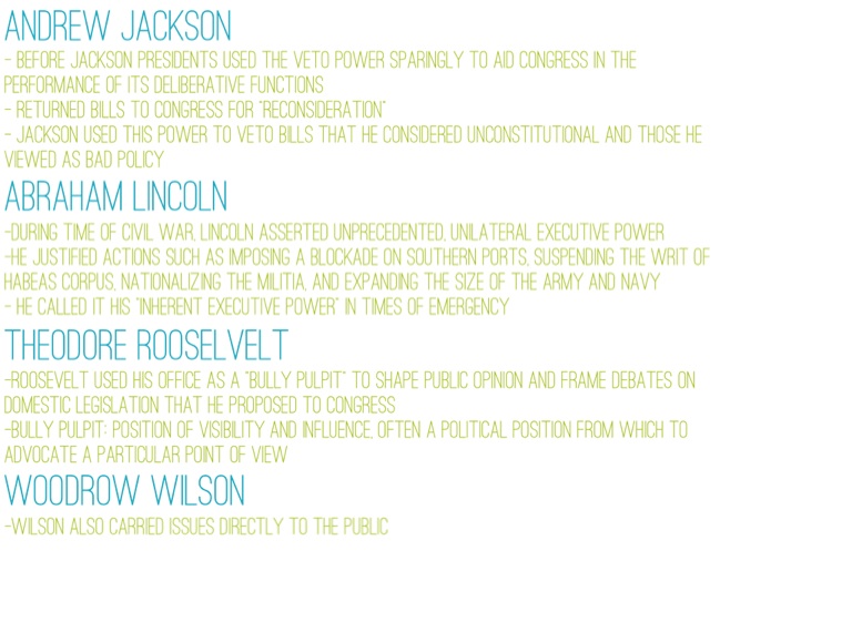 - before Jackson presidents used the veto power sparingly to aid congress in the performance of its deliberative functions