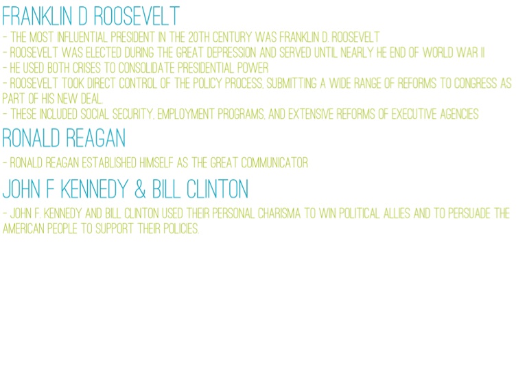 - John F. Kennedy and Bill Clinton used their personal charisma to win political allies and to persuade the American people to support their policies.