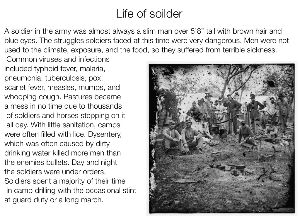 A soldier in the army was almost always a slim man over 5’8” tall with brown hair and blue eyes. The struggles soldiers faced at this time were very dangerous. Men were not used to the climate, exposure, and the food, so they suffered from terrible sickness.
