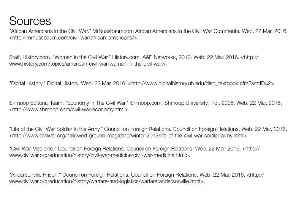 Staff, History.com. "Women in the Civil War." History.com. A&E Networks, 2010. Web. 22 Mar. 2016. <http://www.history.com/topics/american-civil-war/women-in-the-civil-war>.