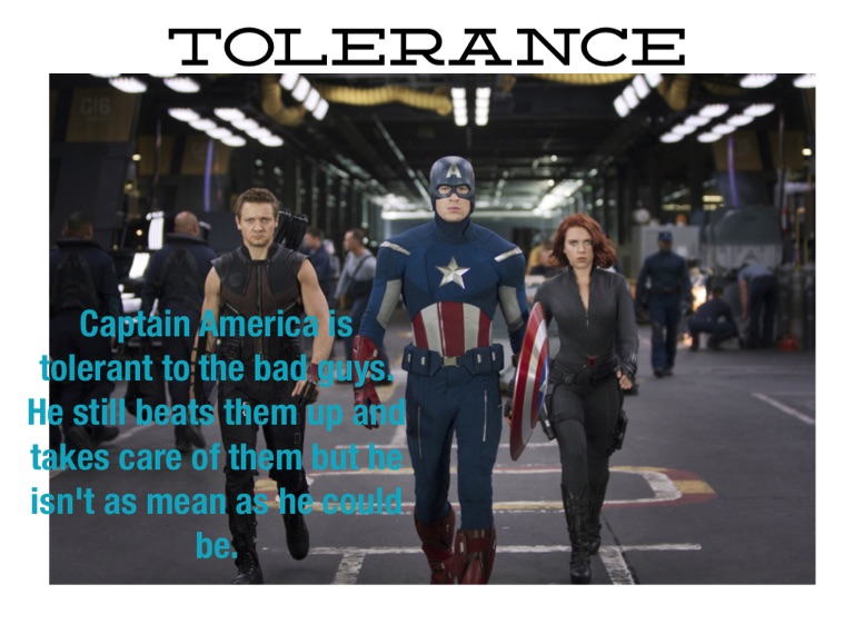 Captain America is tolerant to the bad guys. He still beats them up and takes care of them but he isn't as mean as he could be.
