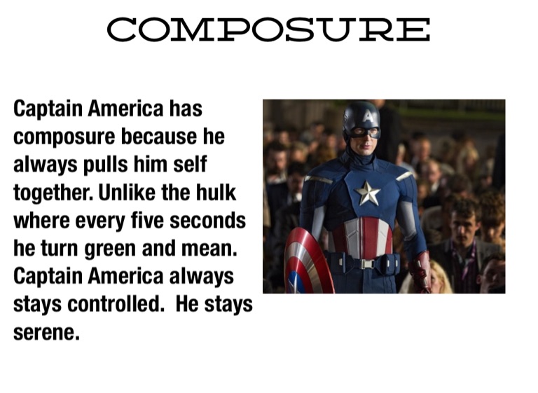 Captain America has composure because he always pulls him self together. Unlike the hulk where every five seconds he turn green and mean. Captain America always stays controlled. He stays serene.