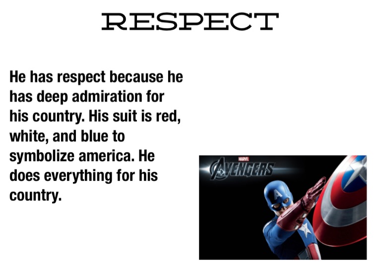 He has respect because he has deep admiration for his country. His suit is red, white, and blue to symbolize america. He does everything for his country.