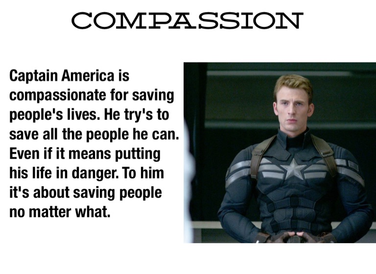 Captain America is compassionate for saving people's lives. He try's to save all the people he can. Even if it means putting his life in danger. To him it's about saving people no matter what.