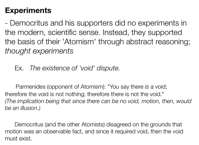 - Democritus and his supporters did no experiments in the modern, scientific sense. Instead, they supported the basis of their 'Atomism' through abstract reasoning; thought experiments