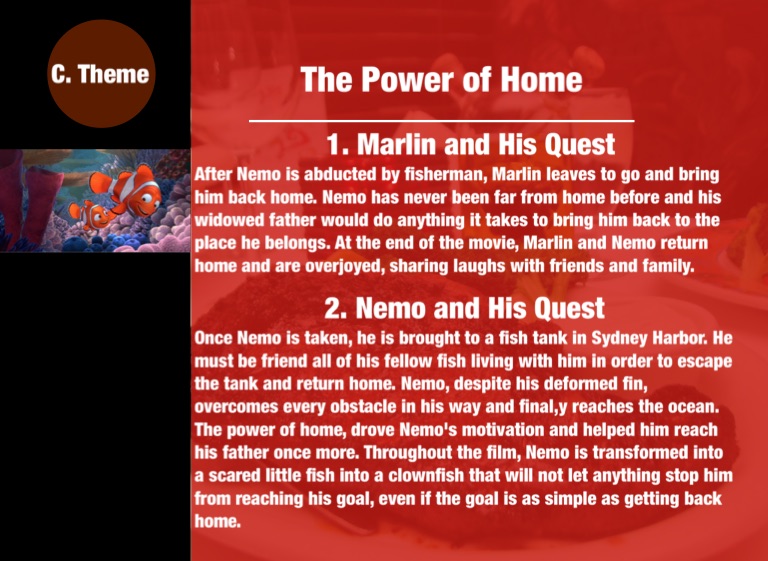 Once Nemo is taken, he is brought to a fish tank in Sydney Harbor. He must be friend all of his fellow fish living with him in order to escape the tank and return home. Nemo, despite his deformed fin, overcomes every obstacle in his way and final,y reaches the ocean. The power of home, drove Nemo's motivation and helped him reach his father once more. Throughout the film, Nemo is transformed into a scared little fish into a clownfish that will not let anything stop him from reaching his goal, even if the goal is as simple as getting back home.