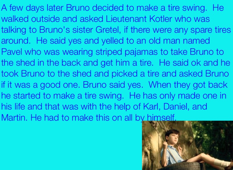 A few days later Bruno decided to make a tire swing. He walked outside and asked Lieutenant Kotler who was talking to Bruno's sister Gretel, if there were any spare tires around. He said yes and yelled to an old man named Pavel who was wearing striped pajamas to take Bruno to the shed in the back and get him a tire. He said ok and he took Bruno to the shed and picked a tire and asked Bruno if it was a good one. Bruno said yes. When they got back he started to make a tire swing. He has only made one in his life and that was with the help of Karl, Daniel, and Martin. He had to make this on all by himself.