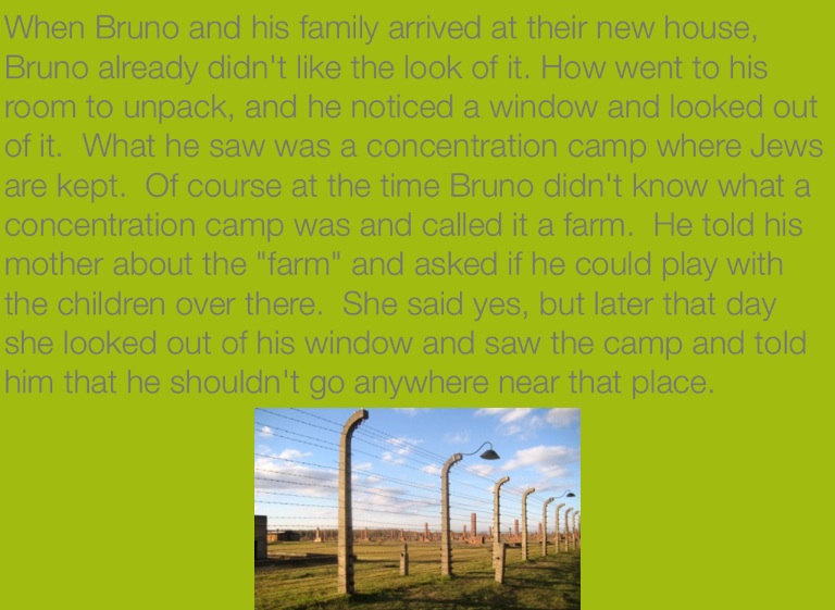 When Bruno and his family arrived at their new house, Bruno already didn't like the look of it. How went to his room to unpack, and he noticed a window and looked out of it. What he saw was a concentration camp where Jews are kept. Of course at the time Bruno didn't know what a concentration camp was and called it a farm. He told his mother about the "farm" and asked if he could play with the children over there. She said yes, but later that day she looked out of his window and saw the camp and told him that he shouldn't go anywhere near that place.