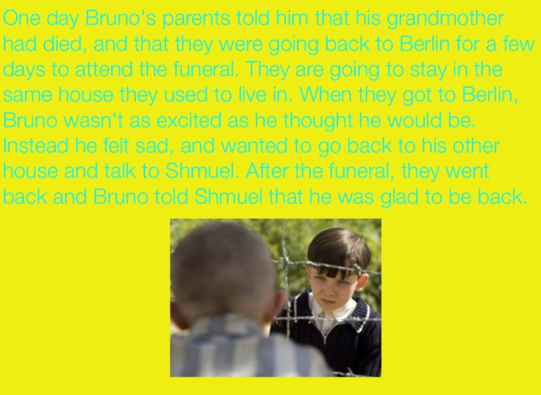 One day Bruno's parents told him that his grandmother had died, and that they were going back to Berlin for a few days to attend the funeral. They are going to stay in the same house they used to live in. When they got to Berlin, Bruno wasn't as excited as he thought he would be. Instead he felt sad, and wanted to go back to his other house and talk to Shmuel. After the funeral, they went back and Bruno told Shmuel that he was glad to be back.