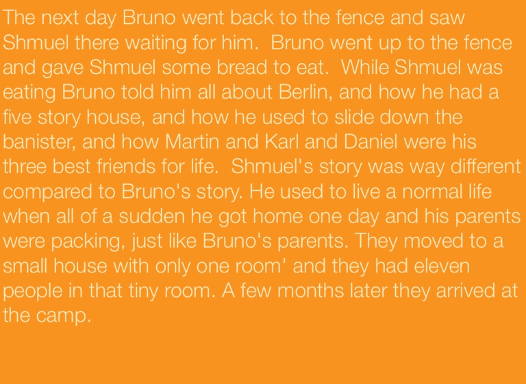 The next day Bruno went back to the fence and saw Shmuel there waiting for him. Bruno went up to the fence and gave Shmuel some bread to eat. While Shmuel was eating Bruno told him all about Berlin, and how he had a five story house, and how he used to slide down the banister, and how Martin and Karl and Daniel were his three best friends for life. Shmuel's story was way different compared to Bruno's story. He used to live a normal life when all of a sudden he got home one day and his parents were packing, just like Bruno's parents. They moved to a small house with only one room' and they had eleven people in that tiny room. A few months later they arrived at the camp.