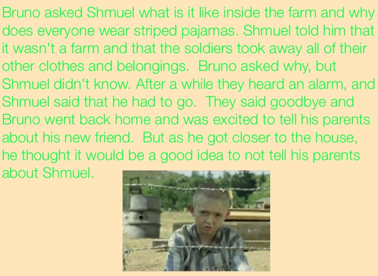 Bruno asked Shmuel what is it like inside the farm and why does everyone wear striped pajamas. Shmuel told him that it wasn't a farm and that the soldiers took away all of their other clothes and belongings. Bruno asked why, but Shmuel didn't know. After a while they heard an alarm, and Shmuel said that he had to go. They said goodbye and Bruno went back home and was excited to tell his parents about his new friend. But as he got closer to the house, he thought it would be a good idea to not tell his parents about Shmuel.