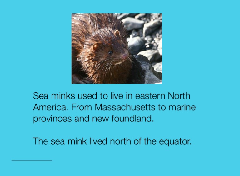 Sea minks used to live in eastern North America. From Massachusetts to marine provinces and new foundland.