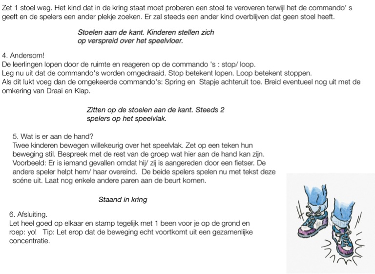 Twee kinderen bewegen willekeurig over het speelvlak. Zet op een teken hun beweging stil. Bespreek met de rest van de groep wat hier aan de hand kan zijn. Voorbeeld: Er is iemand gevallen omdat hij/ zij is aangereden door een fietser. De andere speler helpt hem/ haar overeind. De beide spelers spelen nu met tekst deze scéne uit. Laat nog enkele andere paren aan de beurt komen.