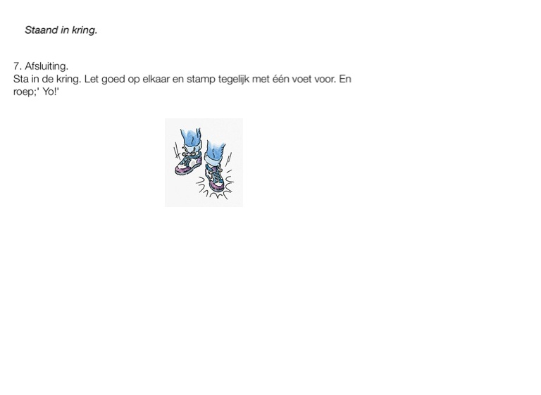 Sta in de kring. Let goed op elkaar en stamp tegelijk met één voet voor. En roep;' Yo!'