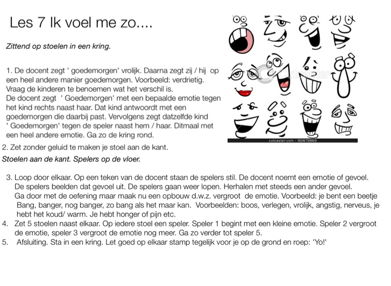 3. Loop door elkaar. Op een teken van de docent staan de spelers stil. De docent noemt een emotie of gevoel.