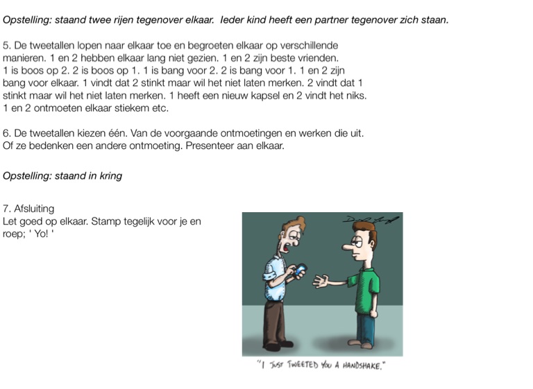 6. De tweetallen kiezen één. Van de voorgaande ontmoetingen en werken die uit. Of ze bedenken een andere ontmoeting. Presenteer aan elkaar.