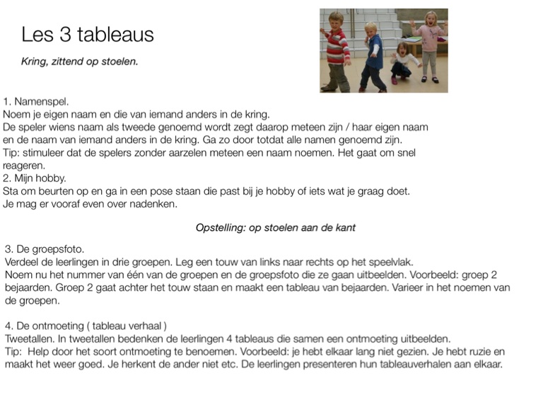 Tweetallen. In tweetallen bedenken de leerlingen 4 tableaus die samen een ontmoeting uitbeelden.