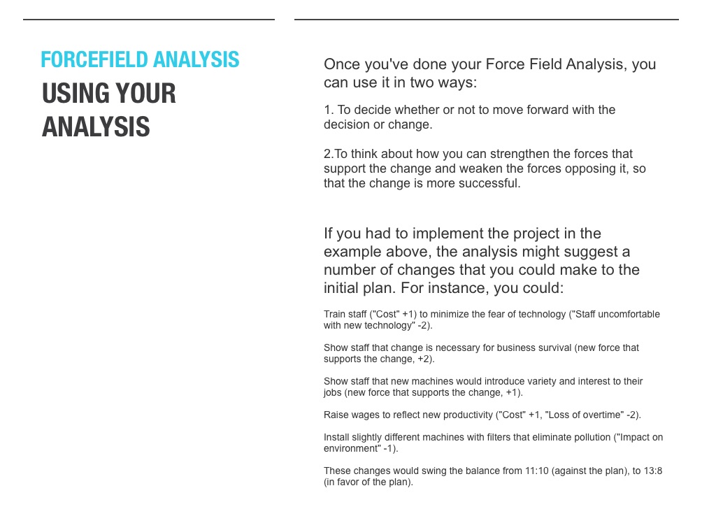 2.To think about how you can strengthen the forces that support the change and weaken the forces opposing it, so that the change is more successful.