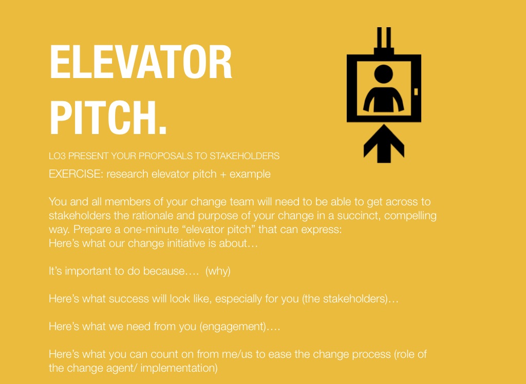 You and all members of your change team will need to be able to get across to stakeholders the rationale and purpose of your change in a succinct, compelling way. Prepare a one-minute “elevator pitch” that can express: