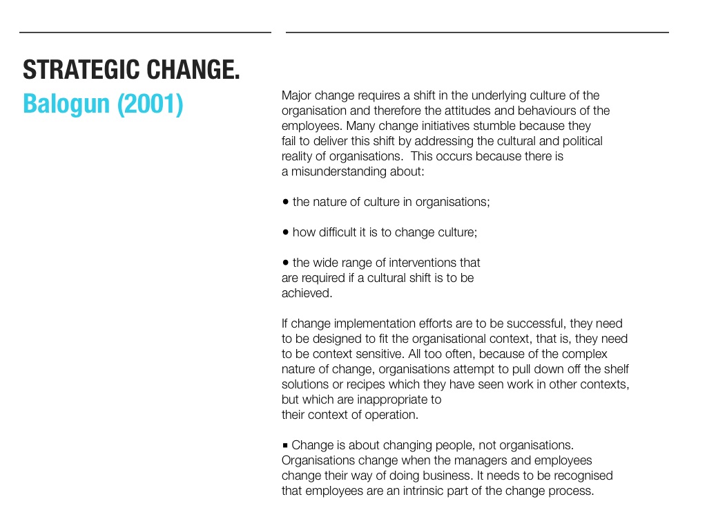 If change implementation efforts are to be successful, they need to be designed to fit the organisational context, that is, they need to be context sensitive. All too often, because of the complex nature of change, organisations attempt to pull down off the shelf solutions or recipes which they have seen work in other contexts, but which are inappropriate to