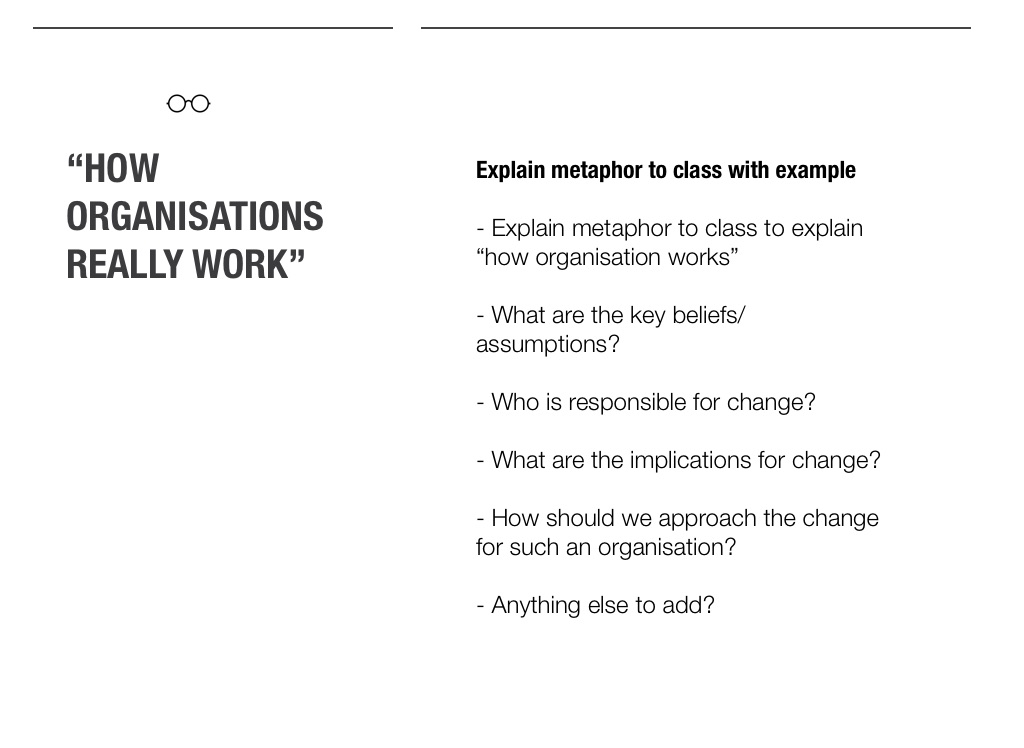 - Explain metaphor to class to explain “how organisation works”