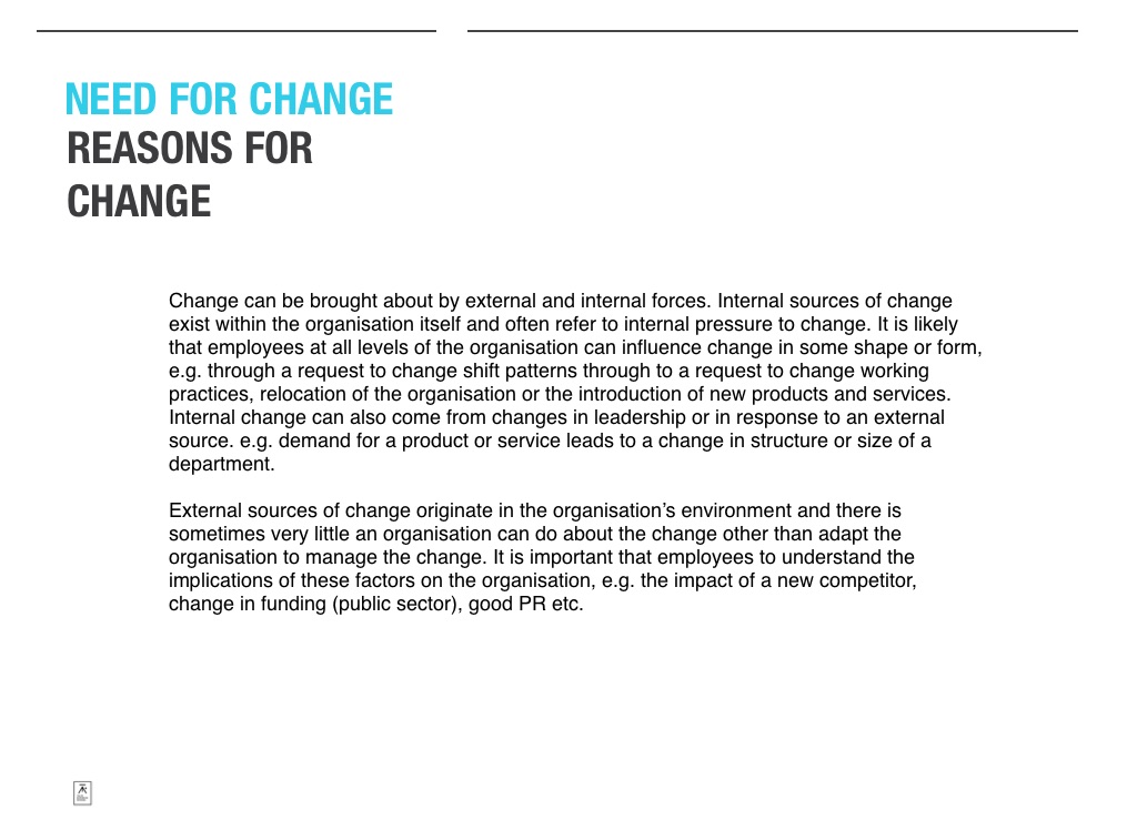 External sources of change originate in the organisation’s environment and there is sometimes very little an organisation can do about the change other than adapt the organisation to manage the change. It is important that employees to understand the implications of these factors on the organisation, e.g. the impact of a new competitor, change in funding (public sector), good PR etc.