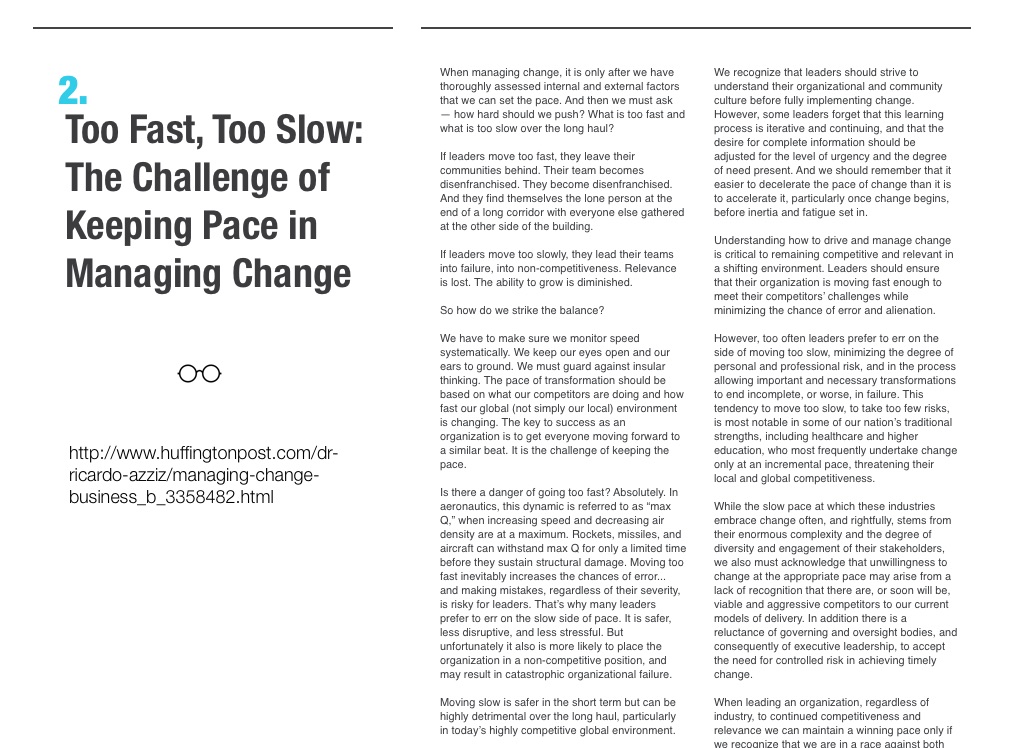 However, too often leaders prefer to err on the side of moving too slow, minimizing the degree of personal and professional risk, and in the process allowing important and necessary transformations to end incomplete, or worse, in failure. This tendency to move too slow, to take too few risks, is most notable in some of our nation’s traditional strengths, including healthcare and higher education, who most frequently undertake change only at an incremental pace, threatening their local and global competitiveness.
