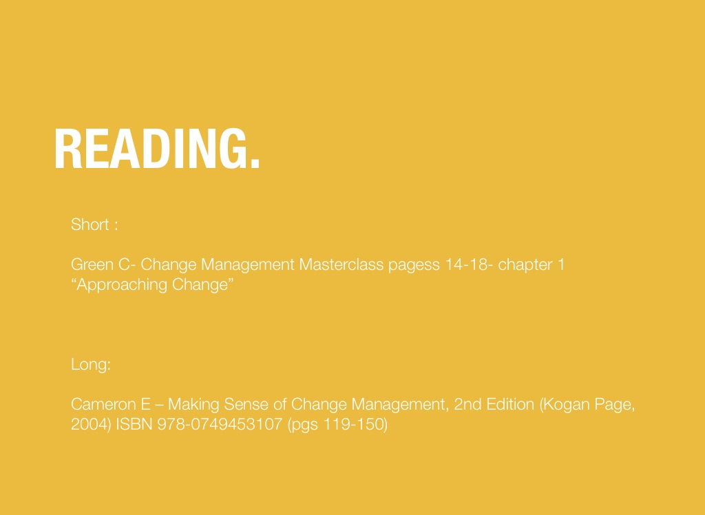Green C- Change Management Masterclass pagess 14-18- chapter 1 “Approaching Change”