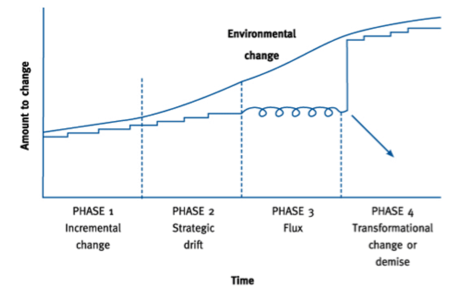 Eventually transformational change is required if the demise of the organisation is to be avoided. Transformational change tends to occur when performance has fallen off significantly, i.e. in times of crisis.