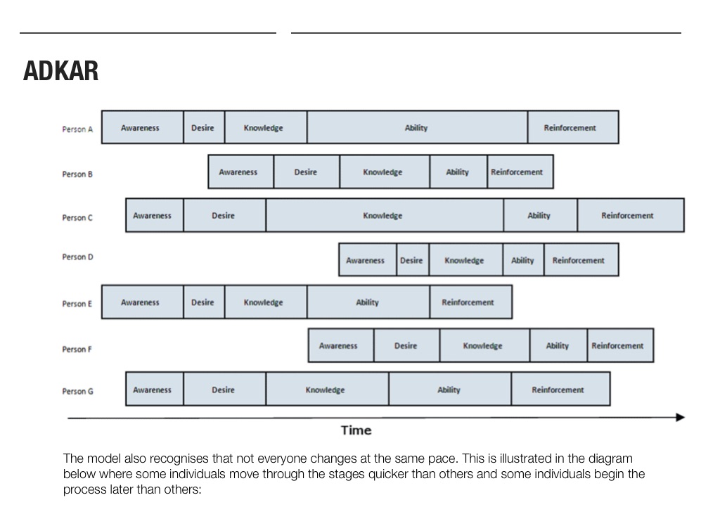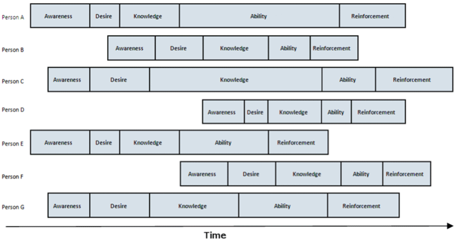 The model also recognises that not everyone changes at the same pace. This is illustrated in the diagram below where some individuals move through the stages quicker than others and some individuals begin the process later than others:
