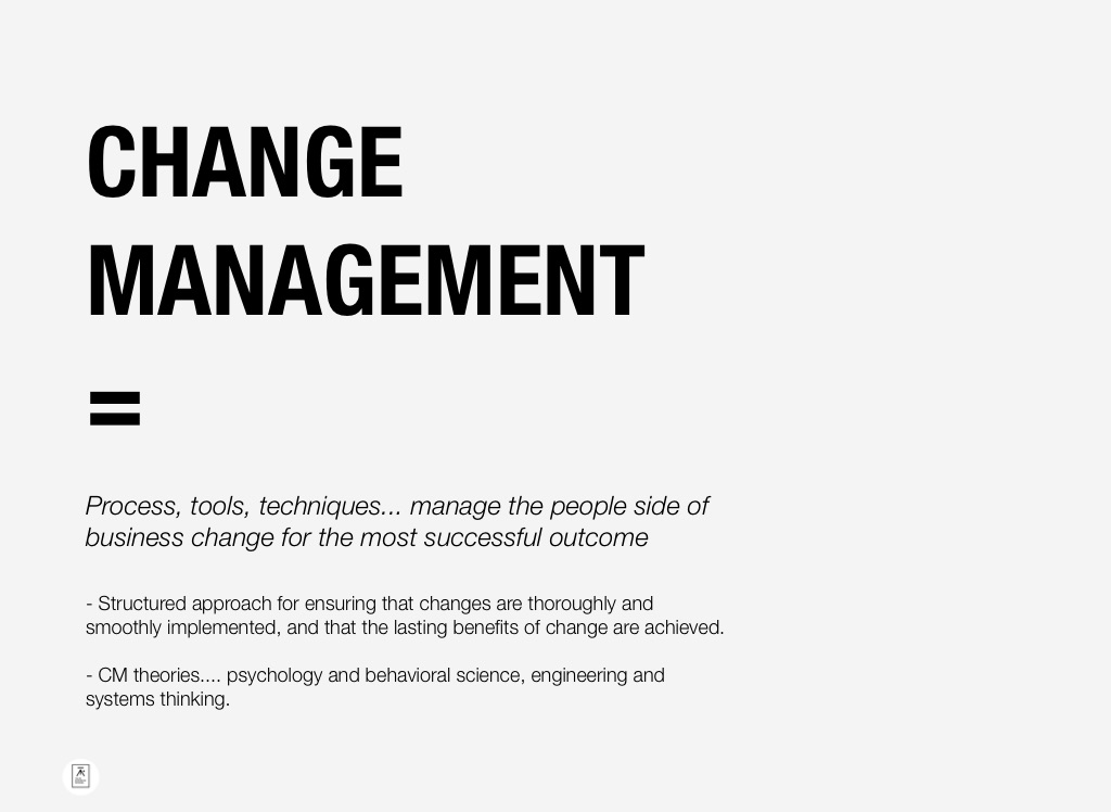 - Structured approach for ensuring that changes are thoroughly and smoothly implemented, and that the lasting benefits of change are achieved.
