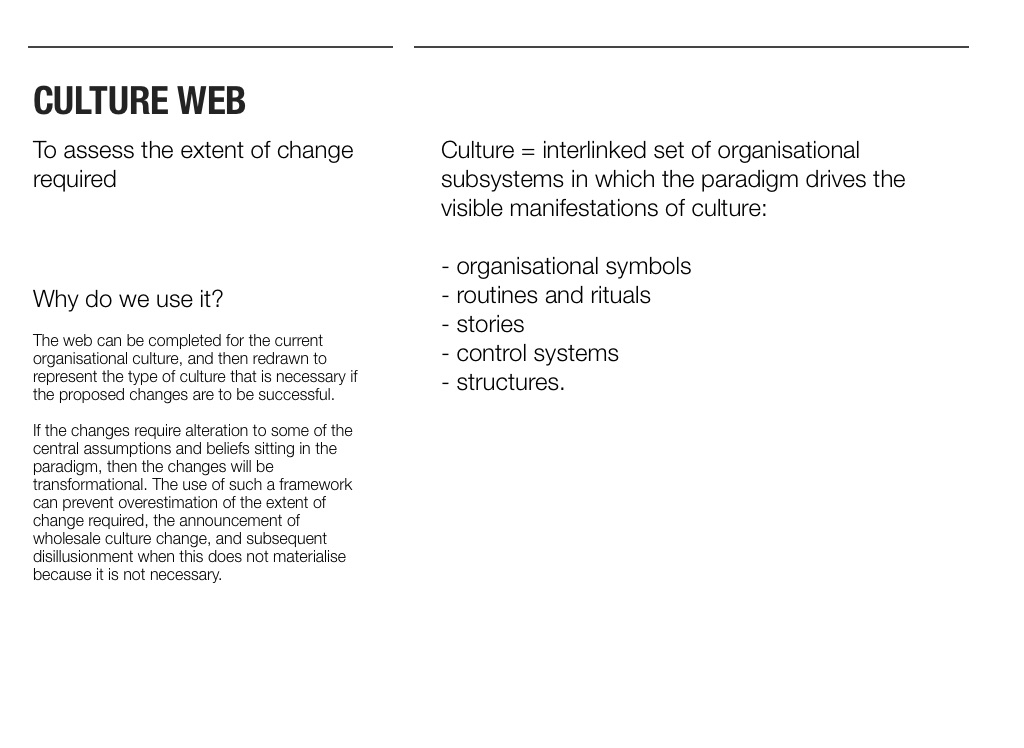 The web can be completed for the current organisational culture, and then redrawn to represent the type of culture that is necessary if the proposed changes are to be successful.