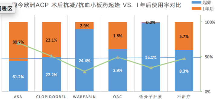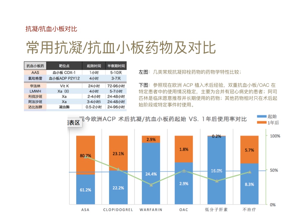 下图:参照现在欧洲 ACP 植入术后经验,双重抗血小板/OAC 在特定患者中的使用情况稳定,主要为合并有冠心病史的患者;阿司匹林是临床愿意推荐并长期使用的药物;其他药物相对只在术后起始阶段或特定事件时使用。