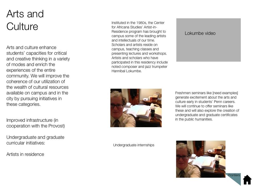 Freshmen seminars like [need examples] generate excitement about the arts and culture early in students’ Penn careers. We will continue to offer seminars like these and will also explore the creation of undergraduate and graduate certificates in the public humanities.