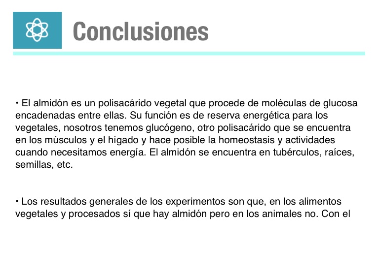 • Los resultados generales de los experimentos son que, en los alimentos vegetales y procesados sí que hay almidón pero en los animales no. Con el contacto con el agua el almidón se rompe y se desprende la glucosa.