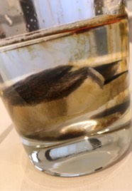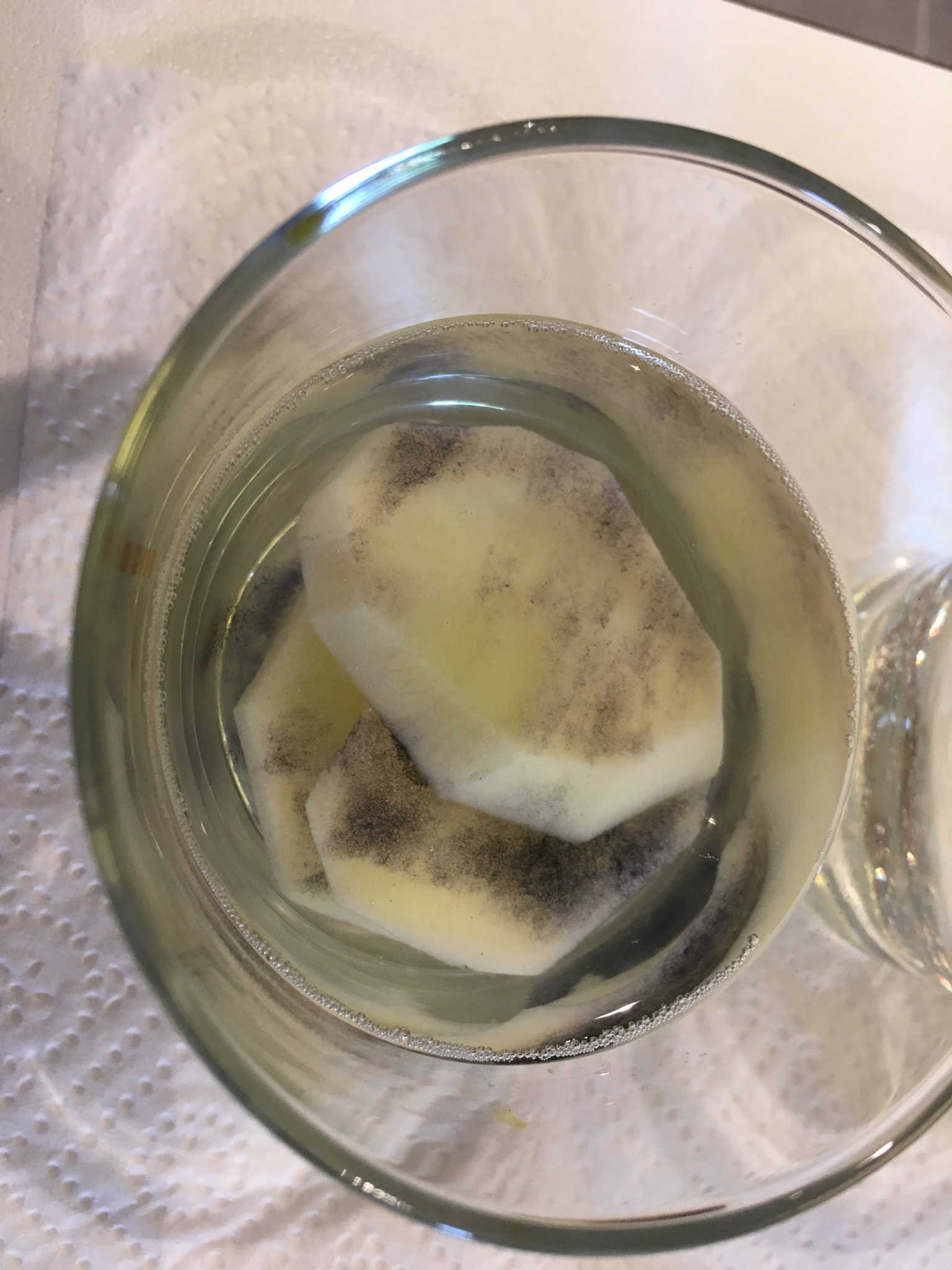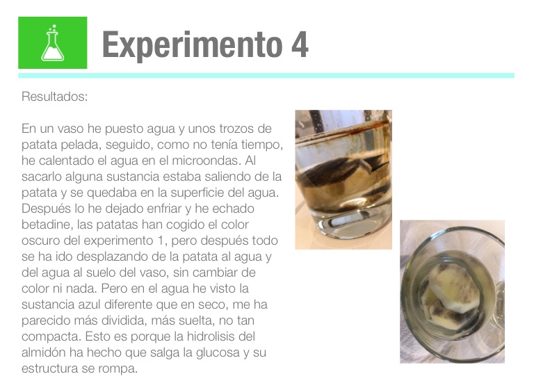 En un vaso he puesto agua y unos trozos de patata pelada, seguido, como no tenía tiempo, he calentado el agua en el microondas. Al sacarlo alguna sustancia estaba saliendo de la patata y se quedaba en la superficie del agua. Después lo he dejado enfriar y he echado betadine, las patatas han cogido el color oscuro del experimento 1, pero después todo se ha ido desplazando de la patata al agua y del agua al suelo del vaso, sin cambiar de color ni nada. Pero en el agua he visto la sustancia azul diferente que en seco, me ha parecido más dividida, más suelta, no tan compacta. Esto es porque la hidrolisis del almidón ha hecho que salga la glucosa y su estructura se rompa.