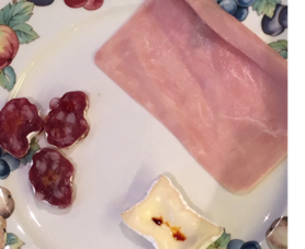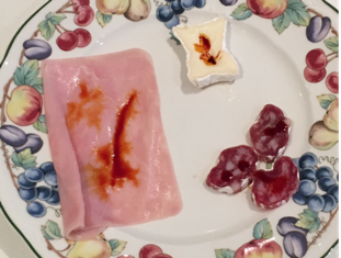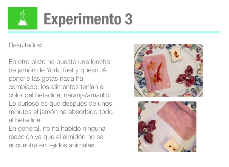 En otro plato he puesto una loncha de jamón de York, fuet y queso. Al ponerle las gotas nada ha cambiado, los alimentos tenían el color del betadine, naranja/amarillo. Lo curioso es que después de unos minutos el jamón ha absorbido todo el betadine.