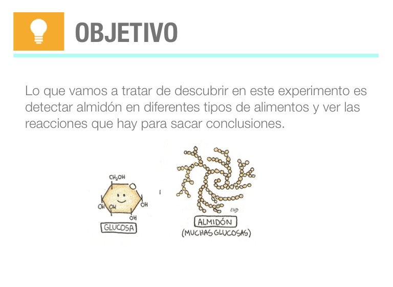 Lo que vamos a tratar de descubrir en este experimento es detectar almidón en diferentes tipos de alimentos y ver las reacciones que hay para sacar conclusiones.