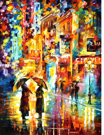 Afremov's style is modern impressionistic. He mainly uses palette knife and oils. He developed a unique technique and style, that makes it impossible to mistake his artwork for any other artist.