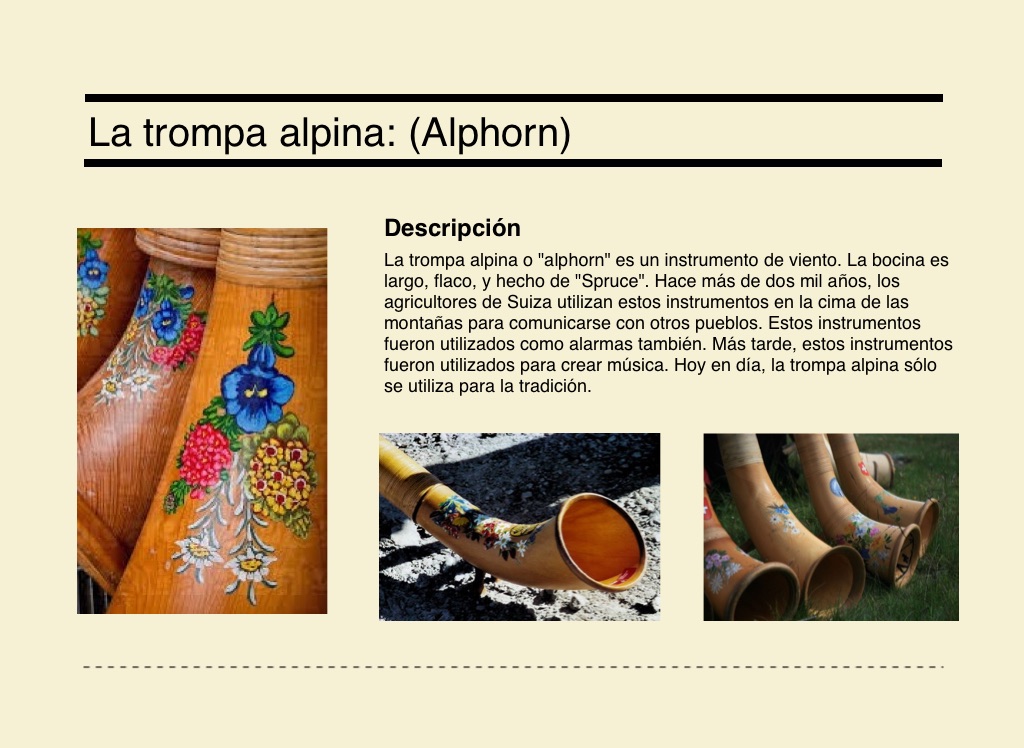La trompa alpina o "alphorn" es un instrumento de viento. La bocina es largo, flaco, y hecho de "Spruce". Hace más de dos mil años, los agricultores de Suiza utilizan estos instrumentos en la cima de las montañas para comunicarse con otros pueblos. Estos instrumentos fueron utilizados como alarmas también. Más tarde, estos instrumentos fueron utilizados para crear música. Hoy en día, la trompa alpina sólo se utiliza para la tradición.
