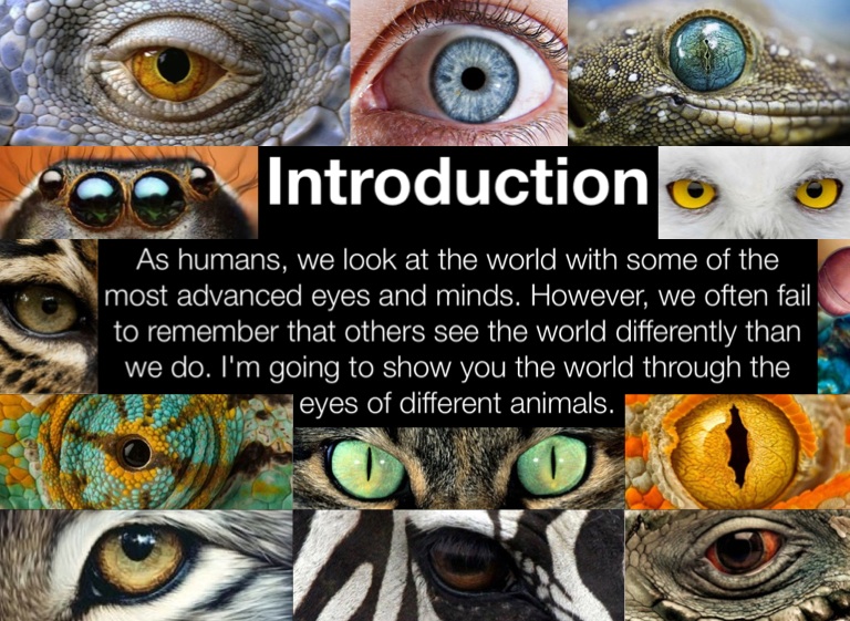 As humans, we look at the world with some of the most advanced eyes and minds. However, we often fail to remember that others see the world differently than we do. I'm going to show you the world through the eyes of different animals.