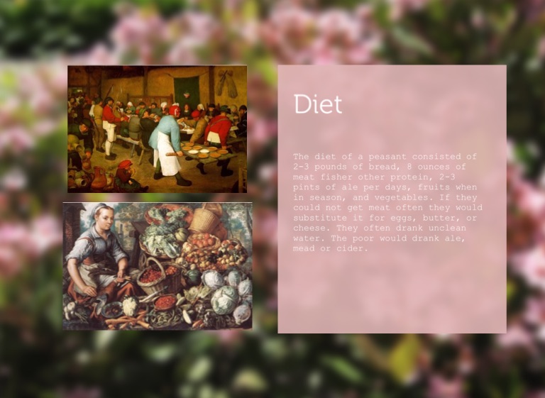 The diet of a peasant consisted of 2-3 pounds of bread, 8 ounces of meat fisher other protein, 2-3 pints of ale per days, fruits when in season, and vegetables. If they could not get meat often they would substitute it for eggs, butter, or cheese. They often drank unclean water. The poor would drank ale, mead or cider.