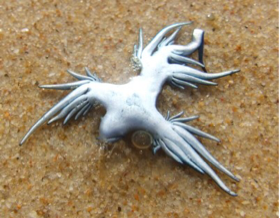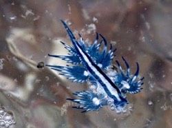 Even with its stinging surprise, the Blue Ocean Slug is cautious about being eaten. As a form of camouflage, it floats on its back at the surface of the water.