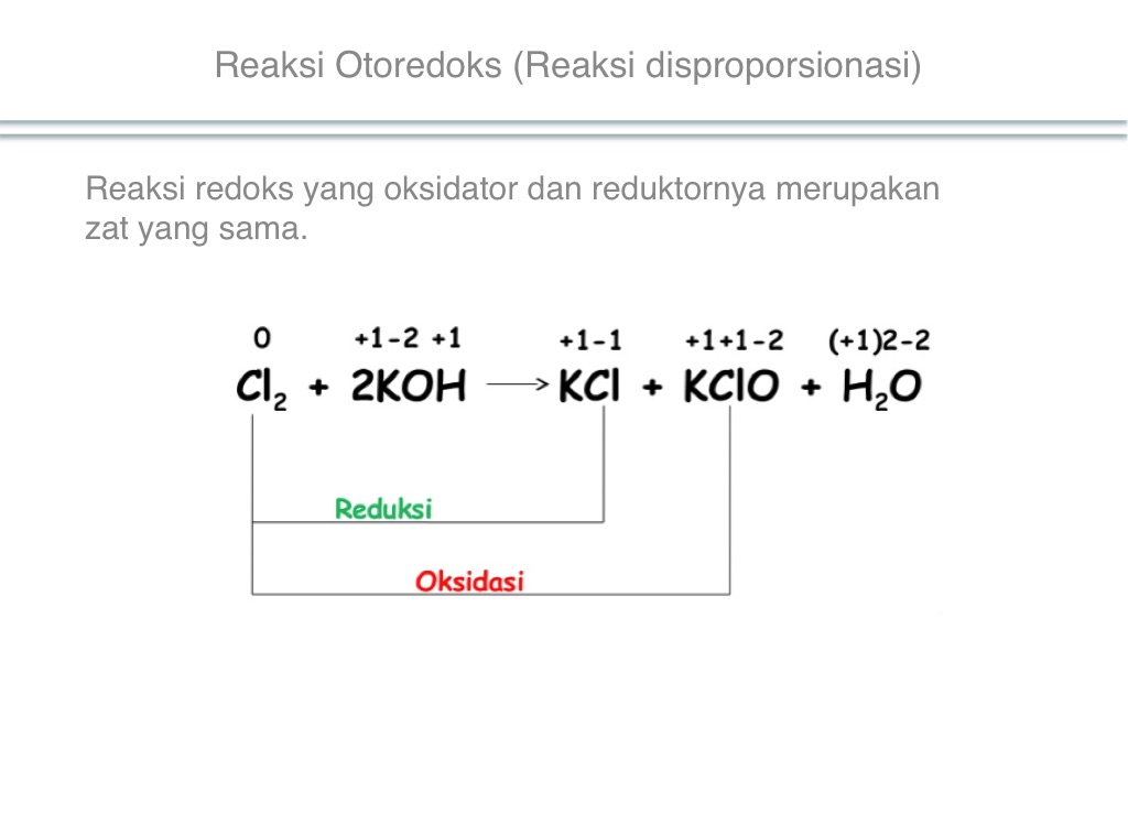 Reaksi redoks yang oksidator dan reduktornya merupakan zat yang sama.